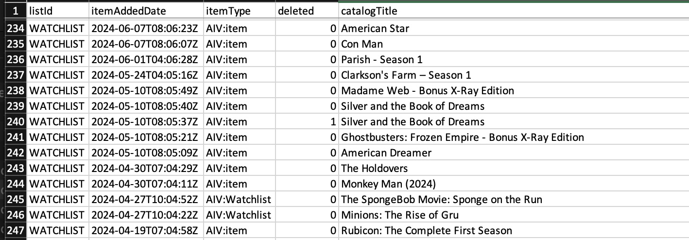 I’m pointing this out because when we merge the information in this dataset we need to combine it in a way that we can use public databases for movie and TV titles. This means we have figure out what these things are. Now I say “we” but really it’s Claude. Because claude comes up with a matching algorithm. But when it breaks we have to go back and forth with Claude to point out what is broken. This happened a lot when I was importing the Amazon data. The titles on the previously viewed lists were.. unique. For TV series it would have the format of: